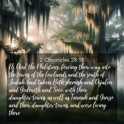 18. And the Philistines, forcing their way into the towns of the lowlands and the south of Judah, had taken Beth-shemesh and Aijalon and Gederoth and Soco, with their daughter-towns, as well as Timnah and Gimzo and their daughter-towns, and were living there.
