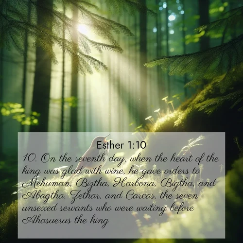 10. On the seventh day, when the heart of the king was glad with wine, he gave orders to Mehuman, Biztha, Harbona, Bigtha, and Abagtha, Zethar, and Carcas, the seven unsexed servants who were waiting before Ahasuerus the king,