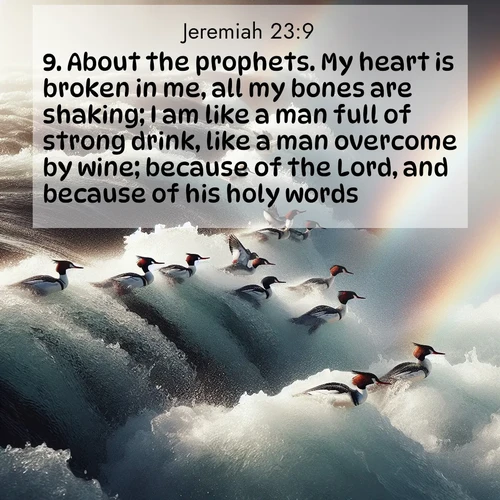 Jeremiah 23:9. About the prophets. My heart is broken in me, all my bones are shaking; I am like a man full of strong drink, like a man overcome by wine; because of the Lord, and because of his holy words.