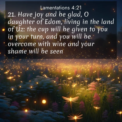 21. Have joy and be glad, O daughter of Edom, living in the land of Uz: the cup will be given to you in your turn, and you will be overcome with wine and your shame will be seen.