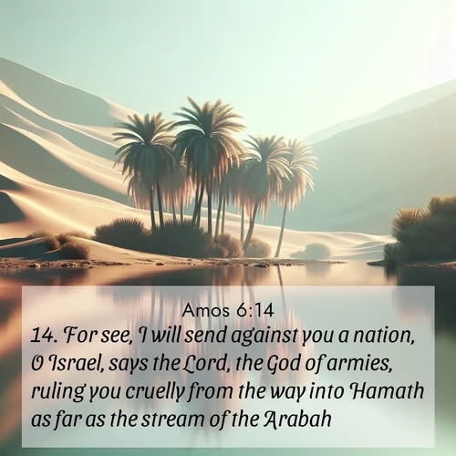 Amos 6:14. For see, I will send against you a nation, O Israel, says the Lord, the God of armies, ruling you cruelly from the way into Hamath as far as the stream of the Arabah.
