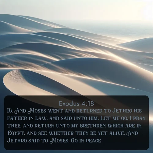 Exodus 4:18. And Moses went and returned to Jethro his father in law, and said unto him, Let me go, I pray thee, and return unto my brethren which are in Egypt, and see whether they be yet alive. And Jethro said to Moses, Go in peace.