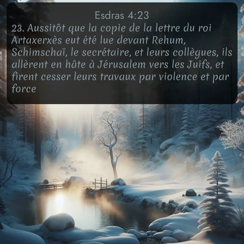 Esdras 4:23 . Aussitôt que la copie de la lettre du roi Artaxerxès eut été lue devant Rehum, Schimschaï, le secrétaire, et leurs collègues, ils allèrent en hâte à Jérusalem vers les Juifs, et firent cesser leurs travaux par violence et par force.