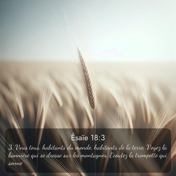 Admirez des images bibliques évoquant l’automne, avec des couleurs chaudes de feuilles mortes, des champs moissonnés et des bois tranquilles. Ces paysages inspirants reflètent la transition et la beauté de la création divine. Téléchargez des versets comme Segond Ésaïe 18:3 .Les images de versets bibliques sont créées à partir des versets de la Bible Louis Segond (LSG 1910,La Sainte Bible par Louis Segond 1910). Cette traduction française de la Bible, publiée en 1910, est dans le domaine public et correspond dans les grandes lignes à la version française de la King James Bible en Anglais. Vous pouvez consulter La Bible Louis Segond gratuitement online sur notre site. Nous vous encourageons à inclure un lien vers ces pages pour faire connaître cette ressource gratuite à d'autres. L'église Renens AB est content de mettre les images à disposition gratuitement. voir Bible Louis Segond 1912