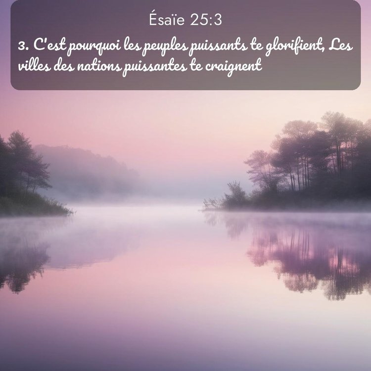 Explorez une collection riche d'images de versets bibliques magnifiquement illustrées par des paysages naturels, comme des cieux colorés, des montagnes imposantes et des rivières tranquilles. Les images mettent en lumière la sérénité de la création divine avec des teintes vives et des typographies soigneusement choisies. Téléchargez et partagez des versets inspirants tels que Segond Ésaïe 25:3 .Les images de versets bibliques sont créées à partir des versets de la Bible Louis Segond (LSG 1910,La Sainte Bible par Louis Segond 1910). Cette traduction française de la Bible, publiée en 1910, est dans le domaine public et correspond dans les grandes lignes à la version française de la King James Bible en Anglais. Vous pouvez consulter La Bible Louis Segond gratuitement online sur notre site. Nous vous encourageons à inclure un lien vers ces pages pour faire connaître cette ressource gratuite à d'autres. L'église Renens AB est content de mettre les images à disposition gratuitement. voir Bible Louis Segond 1912