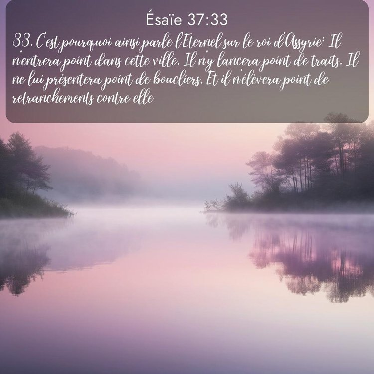 Plongez dans notre collection de versets bibliques associés à des scènes de bord de mer, avec des vagues apaisantes, des plages infinies et des reflets du soleil sur l’eau. Ces images évoquent la paix et la beauté de Dieu. Partagez des versets comme Segond Ésaïe 37:33 .Les images de versets bibliques sont créées à partir des versets de la Bible Louis Segond (LSG 1910,La Sainte Bible par Louis Segond 1910). Cette traduction française de la Bible, publiée en 1910, est dans le domaine public et correspond dans les grandes lignes à la version française de la King James Bible en Anglais. Vous pouvez consulter La Bible Louis Segond gratuitement online sur notre site. Nous vous encourageons à inclure un lien vers ces pages pour faire connaître cette ressource gratuite à d'autres. L'église Renens AB est content de mettre les images à disposition gratuitement. voir Bible Louis Segond 1912