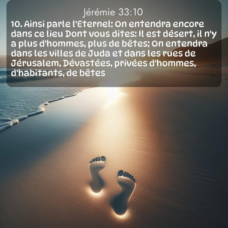 Plongez dans notre collection de versets bibliques magnifiquement illustrés par des photos de plages, avec des vagues douces, des couchers de soleil sur la mer et des plages de sable fin. Ces scènes évoquent la paix et la majesté de Dieu. Téléchargez et partagez des versets inspirants comme Segond Jérémie 33:10 .Les images de versets bibliques sont créées à partir des versets de la Bible Louis Segond (LSG 1910,La Sainte Bible par Louis Segond 1910). Cette traduction française de la Bible, publiée en 1910, est dans le domaine public et correspond dans les grandes lignes à la version française de la King James Bible en Anglais. Vous pouvez consulter La Bible Louis Segond gratuitement online sur notre site. Nous vous encourageons à inclure un lien vers ces pages pour faire connaître cette ressource gratuite à d'autres. L'église Renens AB est content de mettre les images à disposition gratuitement. voir Bible Louis Segond 1912