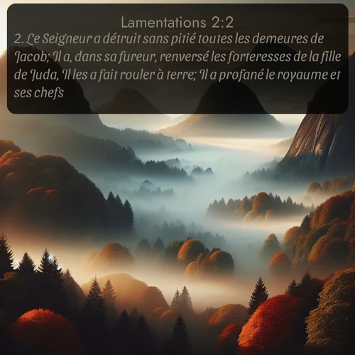 Résumé: Le chapitre 2 des Lamentations peint un tableau poignant de la douleur et de la désolation qui ont frappé Jérusalem après sa destruction. Les thèmes centraux incluent la colère de Dieu, le châtiment pour les péchés du peuple et le contraste entre la grandeur passée de la ville et son état actuel de désolation. Jérémie, l'auteur, décrit la souffrance du peuple, en mettant en évidence la souffrance des enfants et la famine qui ravage la ville. La lamentation souligne également la perte d'espoir et le sentiment d'abandon, alors que Dieu semble éloigné de son peuple. Ce chapitre invite à réfléchir sur la justice divine et la nécessité de revenir à la repentance. En somme, le texte établit un profond désir de restauration et de miséricorde, tout en rappelant les conséquences graves du péché.