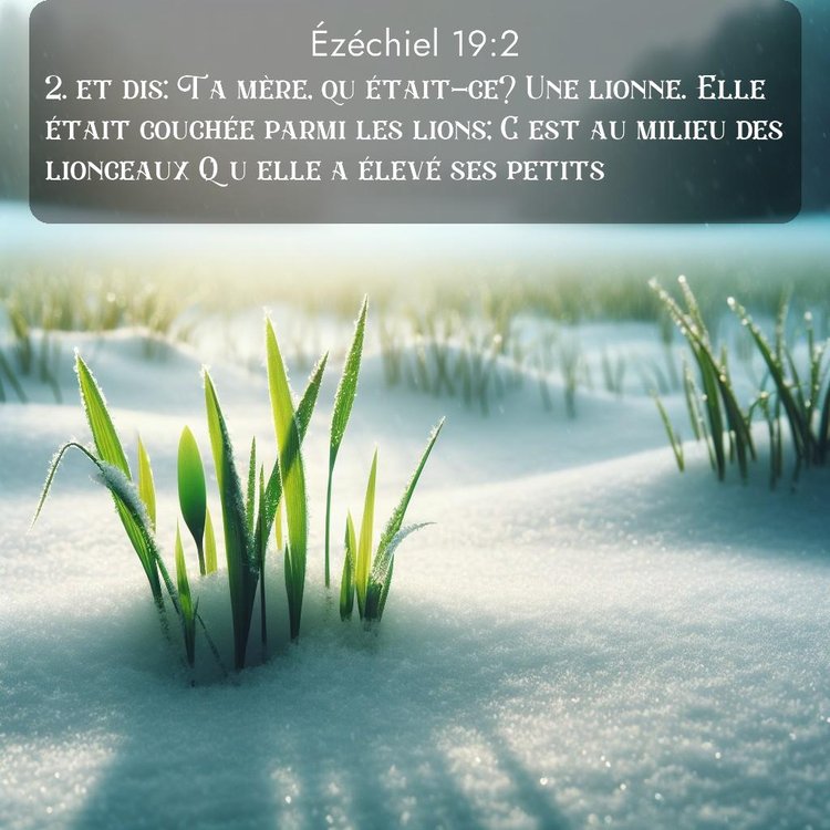 Découvrez des versets bibliques magnifiquement intégrés à des scènes naturelles de saisons variées, avec des ciels clairs d'été, des neiges d'hiver, des feuilles d'automne et des fleurs de printemps. Chaque image capture la splendeur et la paix de la création divine. Partagez des versets comme Segond Ézéchiel 19:2 .Les images de versets bibliques sont créées à partir des versets de la Bible Louis Segond (LSG 1910,La Sainte Bible par Louis Segond 1910). Cette traduction française de la Bible, publiée en 1910, est dans le domaine public et correspond dans les grandes lignes à la version française de la King James Bible en Anglais. Vous pouvez consulter La Bible Louis Segond gratuitement online sur notre site. Nous vous encourageons à inclure un lien vers ces pages pour faire connaître cette ressource gratuite à d'autres. L'église Renens AB est content de mettre les images à disposition gratuitement. voir Bible Louis Segond 1912