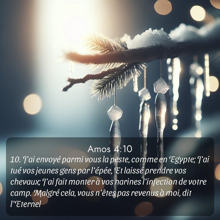 10. J'ai envoyé parmi vous la peste, comme en Egypte; J'ai tué vos jeunes gens par l'épée, Et laissé prendre vos chevaux; J'ai fait monter à vos narines l'infection de votre camp. Malgré cela, vous n'êtes pas revenus à moi, dit l'Eternel.