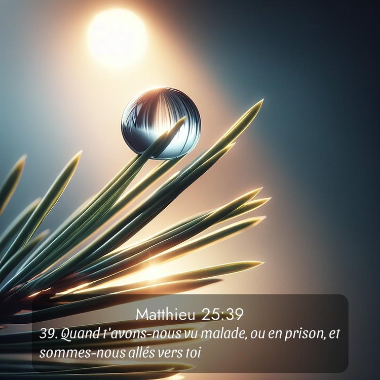 Plongez dans notre collection de versets bibliques associés à des scènes de bord de mer, avec des vagues apaisantes, des plages infinies et des reflets du soleil sur l’eau. Ces images évoquent la paix et la beauté de Dieu. Partagez des versets comme Segond Évangile selon Matthieu 25:39 .Les images de versets bibliques sont créées à partir des versets de la Bible Louis Segond (LSG 1910,La Sainte Bible par Louis Segond 1910). Cette traduction française de la Bible, publiée en 1910, est dans le domaine public et correspond dans les grandes lignes à la version française de la King James Bible en Anglais. Vous pouvez consulter La Bible Louis Segond gratuitement online sur notre site. Nous vous encourageons à inclure un lien vers ces pages pour faire connaître cette ressource gratuite à d'autres. L'église Renens AB est content de mettre les images à disposition gratuitement. voir Bible Louis Segond 1912