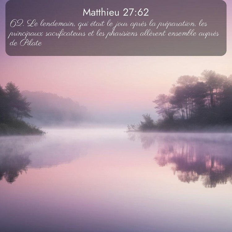 Accédez à une vaste collection d'images de versets bibliques illustrées par des paysages naturels tels que des rivières calmes, des champs en fleurs et des horizons lumineux. Ces images mettent en avant la sérénité et la splendeur de la création de Dieu, accompagnées de polices esthétiques et de couleurs joyeuses. Téléchargez des versets tels que Segond Évangile selon Matthieu 27:62 et partagez-les.Les images de versets bibliques sont créées à partir des versets de la Bible Louis Segond (LSG 1910,La Sainte Bible par Louis Segond 1910). Cette traduction française de la Bible, publiée en 1910, est dans le domaine public et correspond dans les grandes lignes à la version française de la King James Bible en Anglais. Vous pouvez consulter La Bible Louis Segond gratuitement online sur notre site. Nous vous encourageons à inclure un lien vers ces pages pour faire connaître cette ressource gratuite à d'autres. L'église Renens AB est content de mettre les images à disposition gratuitement. voir Bible Louis Segond 1912