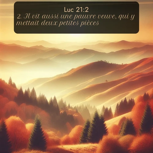 Résumé: Dans le chapitre 21 de l'Évangile de Luc, plusieurs événements clés se déroulent, mettant en lumière des thèmes importants. Tout d'abord, Jésus observe les offrandes faites au temple et souligne la foi d'une veuve qui donne tout ce qu'elle a, mettant en avant le principe selon lequel la valeur des dons est proportionnelle à l'intention et au sacrifice qu'ils représentent. Ensuite, Jésus prophétise la destruction du temple de Jérusalem, annonçant également des signes de la fin des temps. Il met en garde ses disciples contre la tromperie, la persécution et les épreuves qui viendront, tout en offrant l'espoir que ceux qui restent fidèles seront soutenus et témoigneront de leur foi. Le chapitre aborde également le thème de la vigilance, invitant les croyants à être prêts et à rester fermes dans leur foi face aux épreuves à venir. Enfin, Jésus conclut en affirmant que, malgré les troubles, il y a une promesse de rédemption pour ceux qui placeront leur confiance en lui. Ce chapitre invite ainsi les chrétiens à réfléchir sur le véritable sens de la générosité, la persévérance dans les temps difficiles, et l'importance de la fidélité à Dieu.