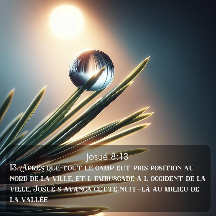 Admirez des images bibliques évoquant l’automne, avec des couleurs chaudes de feuilles mortes, des champs moissonnés et des bois tranquilles. Ces paysages inspirants reflètent la transition et la beauté de la création divine. Téléchargez des versets comme Segond Josué 8:13 .Les images de versets bibliques sont créées à partir des versets de la Bible Louis Segond (LSG 1910,La Sainte Bible par Louis Segond 1910). Cette traduction française de la Bible, publiée en 1910, est dans le domaine public et correspond dans les grandes lignes à la version française de la King James Bible en Anglais. Vous pouvez consulter La Bible Louis Segond gratuitement online sur notre site. Nous vous encourageons à inclure un lien vers ces pages pour faire connaître cette ressource gratuite à d'autres. L'église Renens AB est content de mettre les images à disposition gratuitement. voir Bible Louis Segond 1912