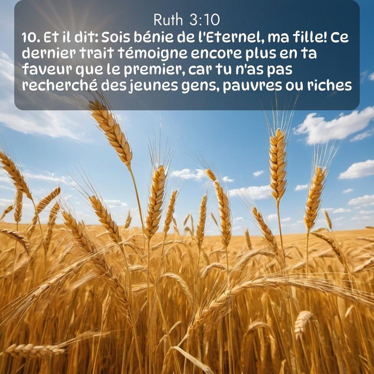 10. Et il dit: Sois bénie de l'Eternel, ma fille! Ce dernier trait témoigne encore plus en ta faveur que le premier, car tu n'as pas recherché des jeunes gens, pauvres ou riches.
