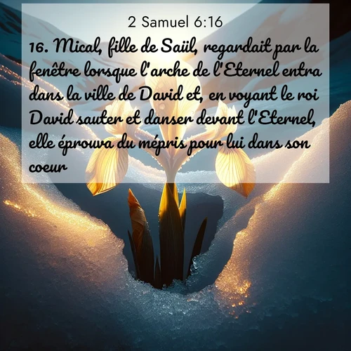 2 Samuel 6:16 . Mical, fille de Saül, regardait par la fenêtre lorsque l'arche de l'Eternel entra dans la ville de David et, en voyant le roi David sauter et danser devant l'Eternel, elle éprouva du mépris pour lui dans son coeur.