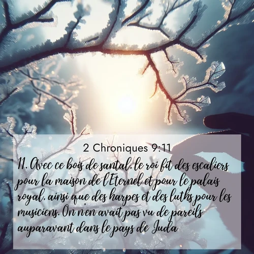 2 Chroniques 9:11 . Avec ce bois de santal, le roi fit des escaliers pour la maison de l'Eternel et pour le palais royal, ainsi que des harpes et des luths pour les musiciens. On n'en avait pas vu de pareils auparavant dans le pays de Juda.