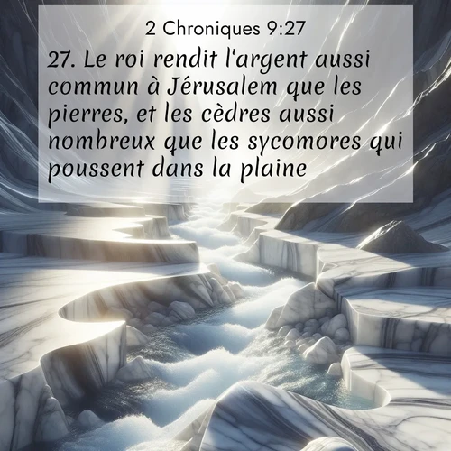 2 Chroniques 9:27 . Le roi rendit l'argent aussi commun à Jérusalem que les pierres, et les cèdres aussi nombreux que les sycomores qui poussent dans la plaine.
