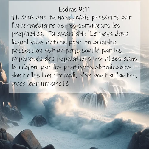 Esdras 9:11 . ceux que tu nous avais prescrits par l'intermédiaire de tes serviteurs les prophètes. Tu avais dit: 'Le pays dans lequel vous entrez pour en prendre possession est un pays souillé par les impuretés des populations installées dans la région, par les pratiques abominables dont elles l'ont rempli, d'un bout à l'autre, avec leur impureté.