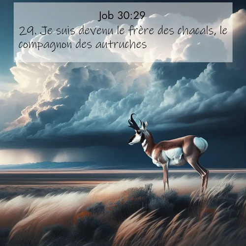 Admirez des images de versets bibliques illustrées par des scènes désertiques, comme des couchers de soleil sur les dunes, des rochers imposants et des cactus solitaires. Ces images capturent la majesté de Dieu dans des lieux arides. Téléchargez et partagez des versets tels que Segond Job 30:29 .Les images de versets bibliques sont créées à partir des versets de la Bible Louis Segond 21. Cette traduction française est fournie par la Maison de la Bible. Vous pouvez consulter Bible Segond 21 (S21) gratuitement online sur notre site. Nous vous encourageons à inclure un lien vers ces pages pour faire connaître cette ressource gratuite à d'autres. L'église Renens AB est content de mettre les images à disposition gratuitement. voir Bible Louis Segond 1912