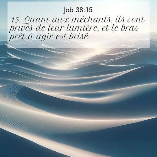 Explorez une sélection inspirante d'images de versets bibliques ornées de photos naturelles, comme des cieux étoilés, des collines verdoyantes et des plages dorées. Chaque image reflète la paix et la beauté de la création divine avec des couleurs éclatantes et des polices variées. Partagez des versets édifiants tels que Segond Job 38:15 .Les images de versets bibliques sont créées à partir des versets de la Bible Louis Segond 21. Cette traduction française est fournie par la Maison de la Bible. Vous pouvez consulter Bible Segond 21 (S21) gratuitement online sur notre site. Nous vous encourageons à inclure un lien vers ces pages pour faire connaître cette ressource gratuite à d'autres. L'église Renens AB est content de mettre les images à disposition gratuitement. voir Bible Louis Segond 1912