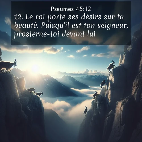 Plongez dans notre collection de versets bibliques inspirants associés à des paysages de dunes infinies, des oasis ombragées et des couchers de soleil sur le désert. Ces images évoquent la grandeur majestueuse de la création divine. Téléchargez et partagez des versets tels que Segond Psaumes 45:12 .Les images de versets bibliques sont créées à partir des versets de la Bible Louis Segond 21. Cette traduction française est fournie par la Maison de la Bible. Vous pouvez consulter Bible Segond 21 (S21) gratuitement online sur notre site. Nous vous encourageons à inclure un lien vers ces pages pour faire connaître cette ressource gratuite à d'autres. L'église Renens AB est content de mettre les images à disposition gratuitement. voir Bible Louis Segond 1912