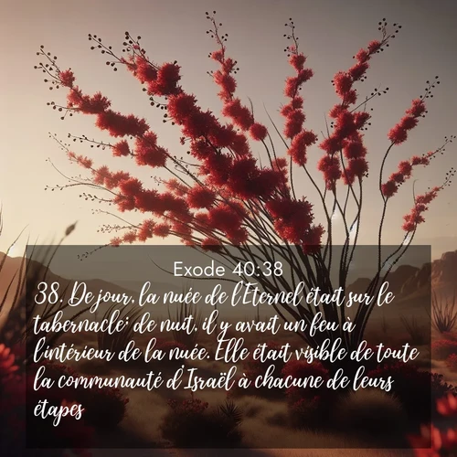 Parcourez une galerie inspirante d'images de versets bibliques avec des photos de la nature, telles que des jardins fleuris, des déserts dorés et des forêts ombragées. Les images choisies capturent l'essence paisible et joyeuse de la création de Dieu, avec des couleurs éclatantes et des polices harmonieuses. Partagez des versets comme Segond Exode 40:38 .Les images de versets bibliques sont créées à partir des versets de la Bible Louis Segond 21. Cette traduction française est fournie par la Maison de la Bible. Vous pouvez consulter Bible Segond 21 (S21) gratuitement online sur notre site. Nous vous encourageons à inclure un lien vers ces pages pour faire connaître cette ressource gratuite à d'autres. L'église Renens AB est content de mettre les images à disposition gratuitement. voir Bible Louis Segond 1912