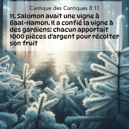 11. Salomon avait une vigne à Baal-Hamon. Il a confié la vigne à des gardiens: chacun apportait 1000 pièces d'argent pour récolter son fruit.