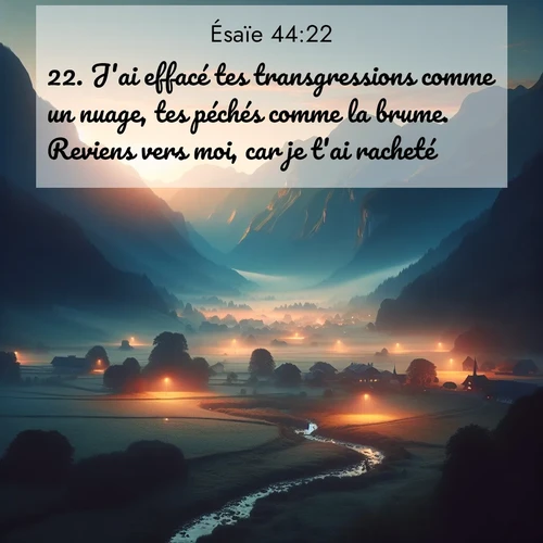 Ésaïe 44:22 . J'ai effacé tes transgressions comme un nuage, tes péchés comme la brume. Reviens vers moi, car je t'ai racheté.