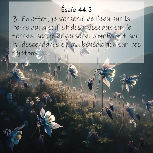 Ésaïe 44:3 . En effet, je verserai de l'eau sur la terre qui a soif et des ruisseaux sur le terrain sec; je déverserai mon Esprit sur ta descendance et ma bénédiction sur tes rejetons.