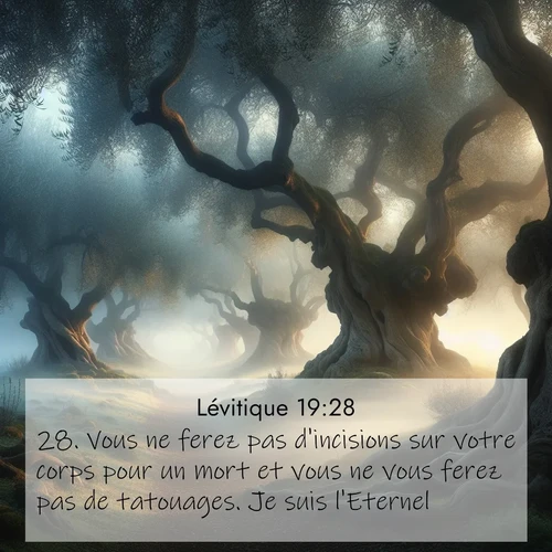 Lévitique 19:28 . Vous ne ferez pas d'incisions sur votre corps pour un mort et vous ne vous ferez pas de tatouages. Je suis l'Eternel.