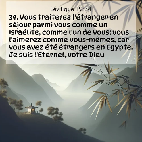 Lévitique 19:34 . Vous traiterez l'étranger en séjour parmi vous comme un Israélite, comme l'un de vous; vous l'aimerez comme vous-mêmes, car vous avez été étrangers en Egypte. Je suis l'Eternel, votre Dieu.