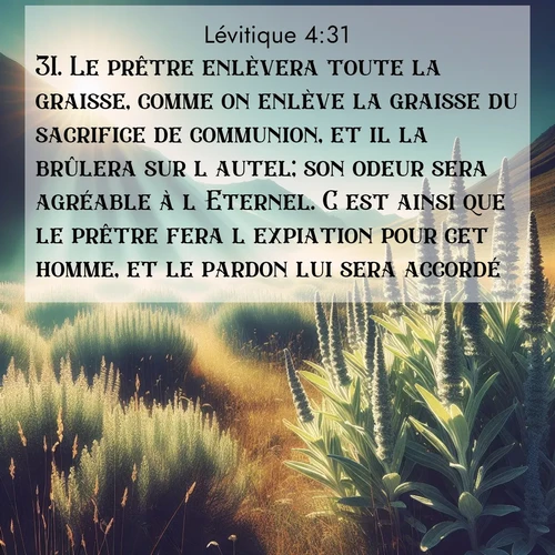 Lévitique 4:31 . Le prêtre enlèvera toute la graisse, comme on enlève la graisse du sacrifice de communion, et il la brûlera sur l'autel; son odeur sera agréable à l'Eternel. C'est ainsi que le prêtre fera l'expiation pour cet homme, et le pardon lui sera accordé.