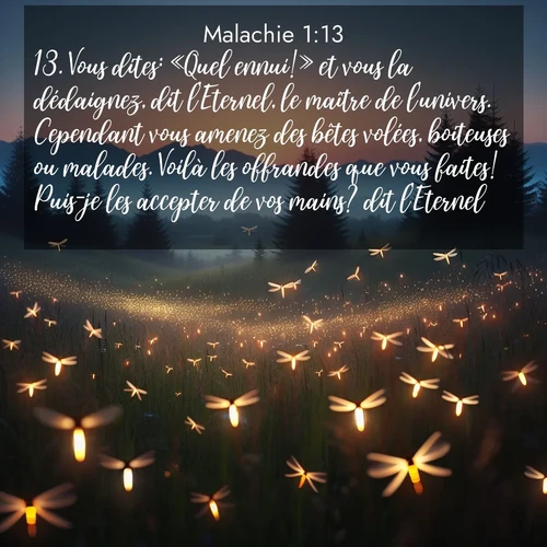 Résumé: Le chapitre 1 du livre de Malachie présente une série de révélations d Dieu envers Israël, exprimant un amour indéfectible pour son peuple. Toutefois, le chapitre met en lumière le mépris et l’infidélité des prêtres et des Israélites envers les commandements de Dieu. Ils offrent des sacrifices défectueux et indignes, ce qui amène Dieu à remettre en question leur respect et leur dévotion. Un thème central est la nécessité de la pureté dans l'adoration et le service à Dieu, soulignant que des sacrifices appropriés sont essentiels pour maintenir une relation correcte avec Lui. Le message insiste sur l'importance de respecter les standards divins dans le culte, plutôt que de céder à la tendance humaine de prendre Dieu à la légère. Par ce chapitre, Malachie appelle les Israélites à revenir à une véritable adoration et à comprendre les conséquences de leur désobéissance. La souveraineté de Dieu et son désir d'une relation authentique avec son peuple sont également des points majeurs de ce texte.