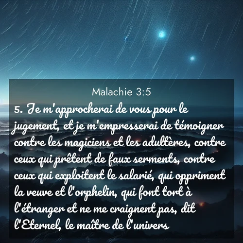Malachie 3:5 . Je m'approcherai de vous pour le jugement, et je m'empresserai de témoigner contre les magiciens et les adultères, contre ceux qui prêtent de faux serments, contre ceux qui exploitent le salarié, qui oppriment la veuve et l'orphelin, qui font tort à l'étranger et ne me craignent pas, dit l'Eternel, le maître de l'univers.