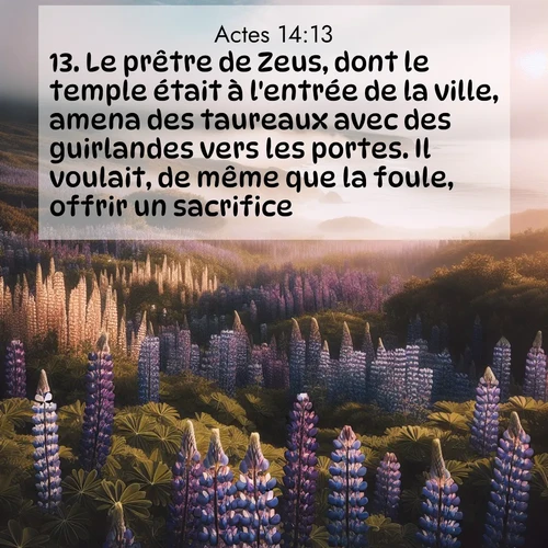 Explorez une collection riche d'images de versets bibliques magnifiquement illustrées par des paysages naturels, comme des cieux colorés, des montagnes imposantes et des rivières tranquilles. Les images mettent en lumière la sérénité de la création divine avec des teintes vives et des typographies soigneusement choisies. Téléchargez et partagez des versets inspirants tels que Segond Actes 14:13.Les images de versets bibliques sont créées à partir des versets de la Bible Louis Segond 21. div>
