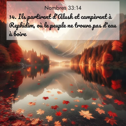 Nombres 33:14 . Ils partirent d'Alush et campèrent à Rephidim, où le peuple ne trouva pas d'eau à boire.